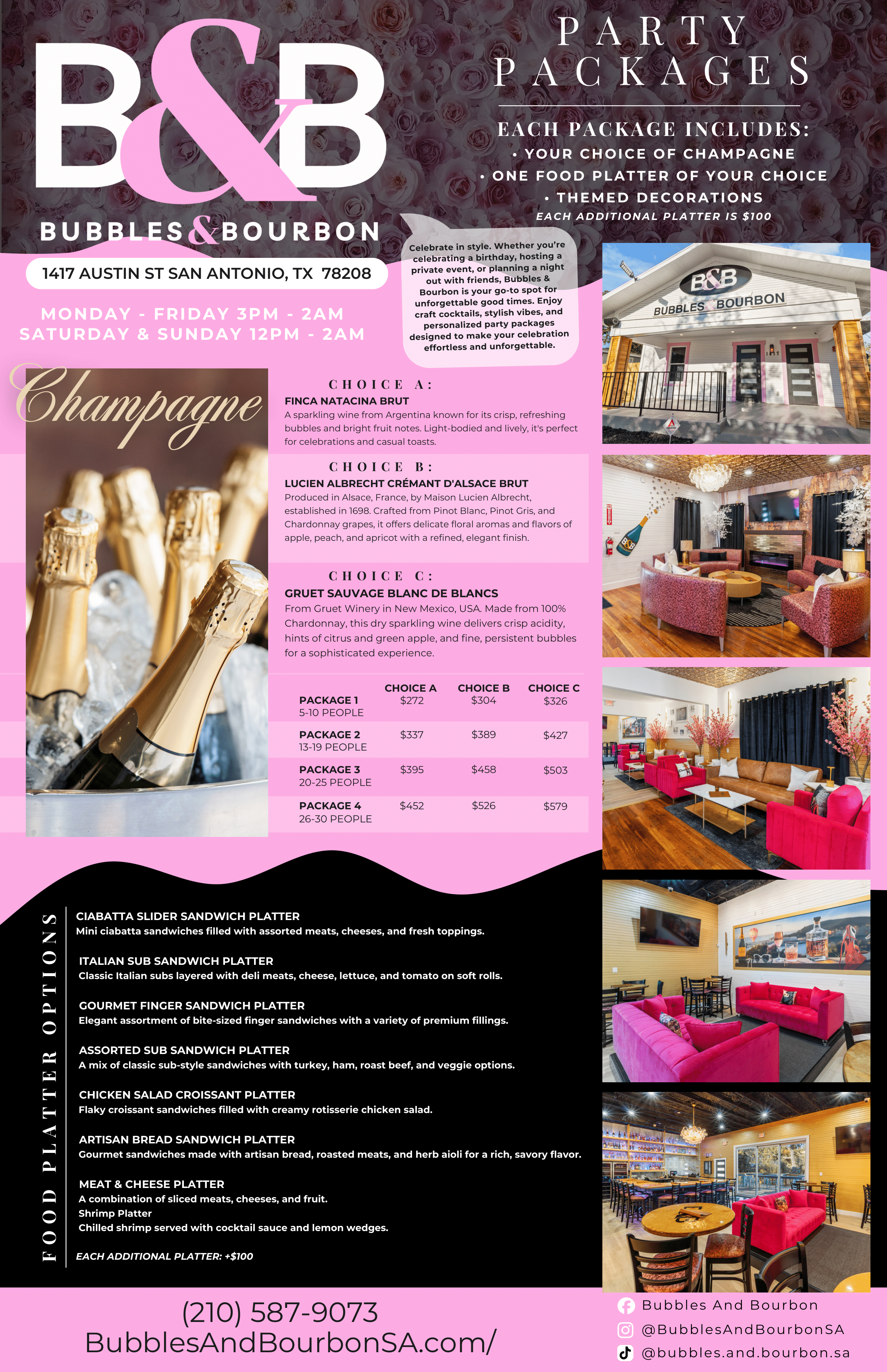 Reserve your spot at Bubbles & Bourbon and make the night yours. Whether it’s a celebration, a night out with friends, or just treating yourself, our packages give you the best seat and experience in the house.